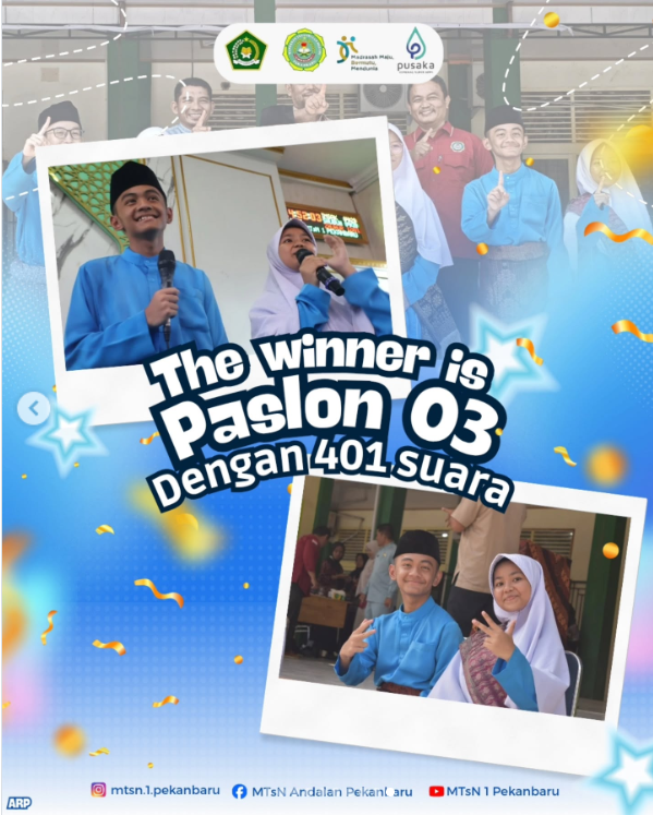 Berdasarkan hasil penghitungan suara, Pasangan Calon nomor urut 03, Ibrahim Diego Malik dan Kayyisah Nazifa P., meraih 401 suara dan resmi ditetapkan sebagai Ketua dan Wakil Ketua OSIM MTsN 1 Kota Pekanbaru masa bakti 2025/2026. Melalui pemilihan OSIM ini, madrasah berhasil mempraktikkan nilai-nilai demokrasi dan menanamkan sikap sportivitas serta tanggung jawab berorganisasi kepada siswa. Kepengurusan OSIM yang baru diharapkan mampu membawa inovasi positif dan menjadi teladan bagi seluruh warga madrasah. (sm)