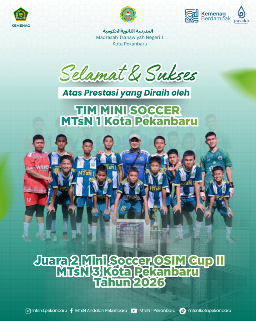 PEKANBARU (HumasAndalan) – Perjuangan luar biasa ditunjukkan oleh tim mini soccer MTsN 1 Kota Pekanbaru dalam ajang bergengsi OSIM Cup II MTsN 3 Kota Pekanbaru 2026. Setelah melewati rangkaian pertandingan yang menguras tenaga dan emosi, tim asuhan Coach Fahmi dan Coach Bryan ini akhirnya resmi menyabet gelar juara kedua (runner-up) pada laga puncak yang digelar Minggu, (19/04/2026).